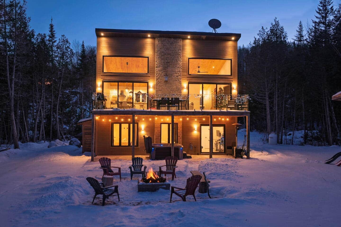 Extérieur bien illuminé, coin feu avec chaises, spa, terrasse/Well-lit exterior, fire pit with chairs, spa, terrace.